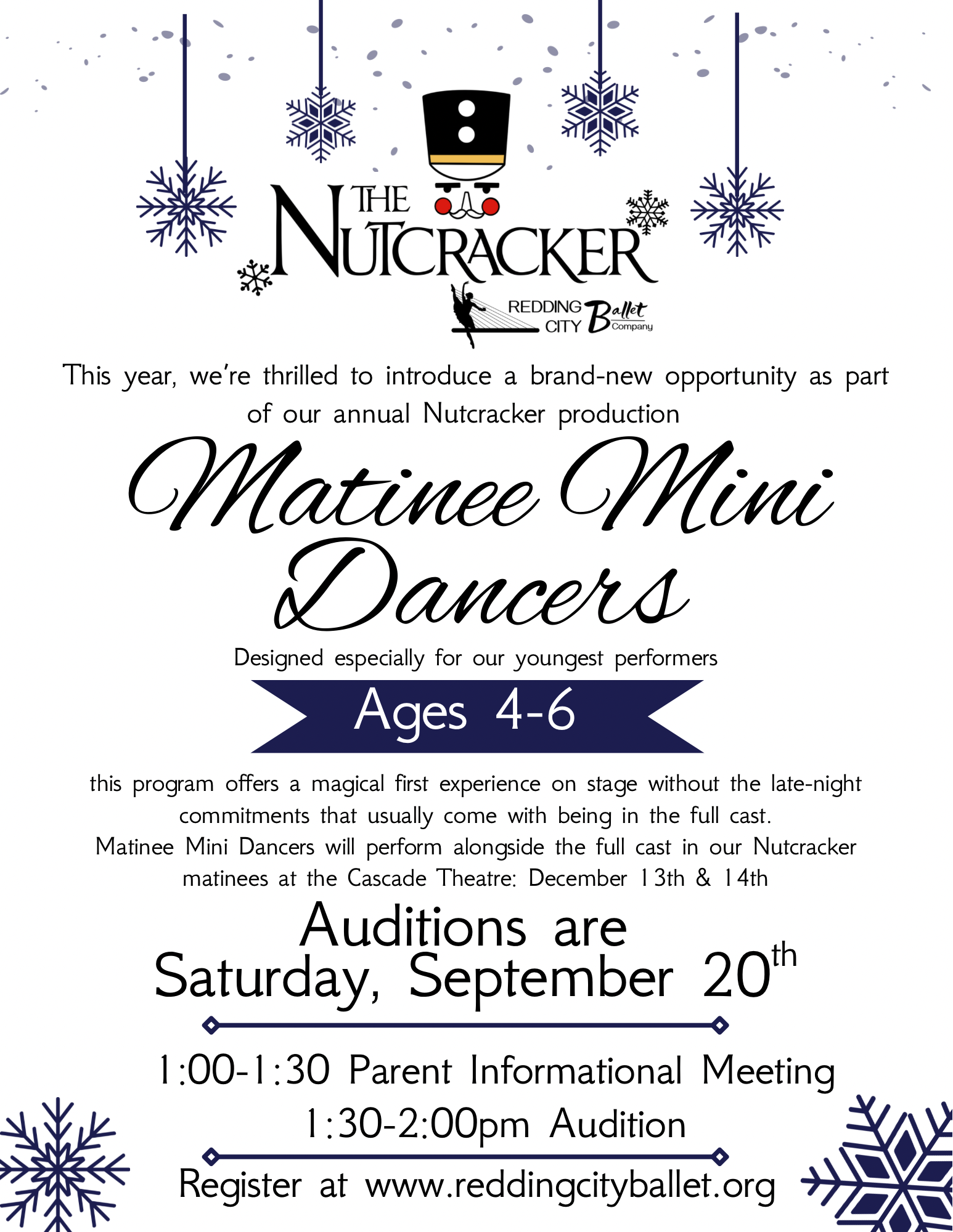 Open auditions for children ages 4 to 6 to step in to the world of dancing in Redding City Ballet’s The Nutcracker at the Cascade Theatre.